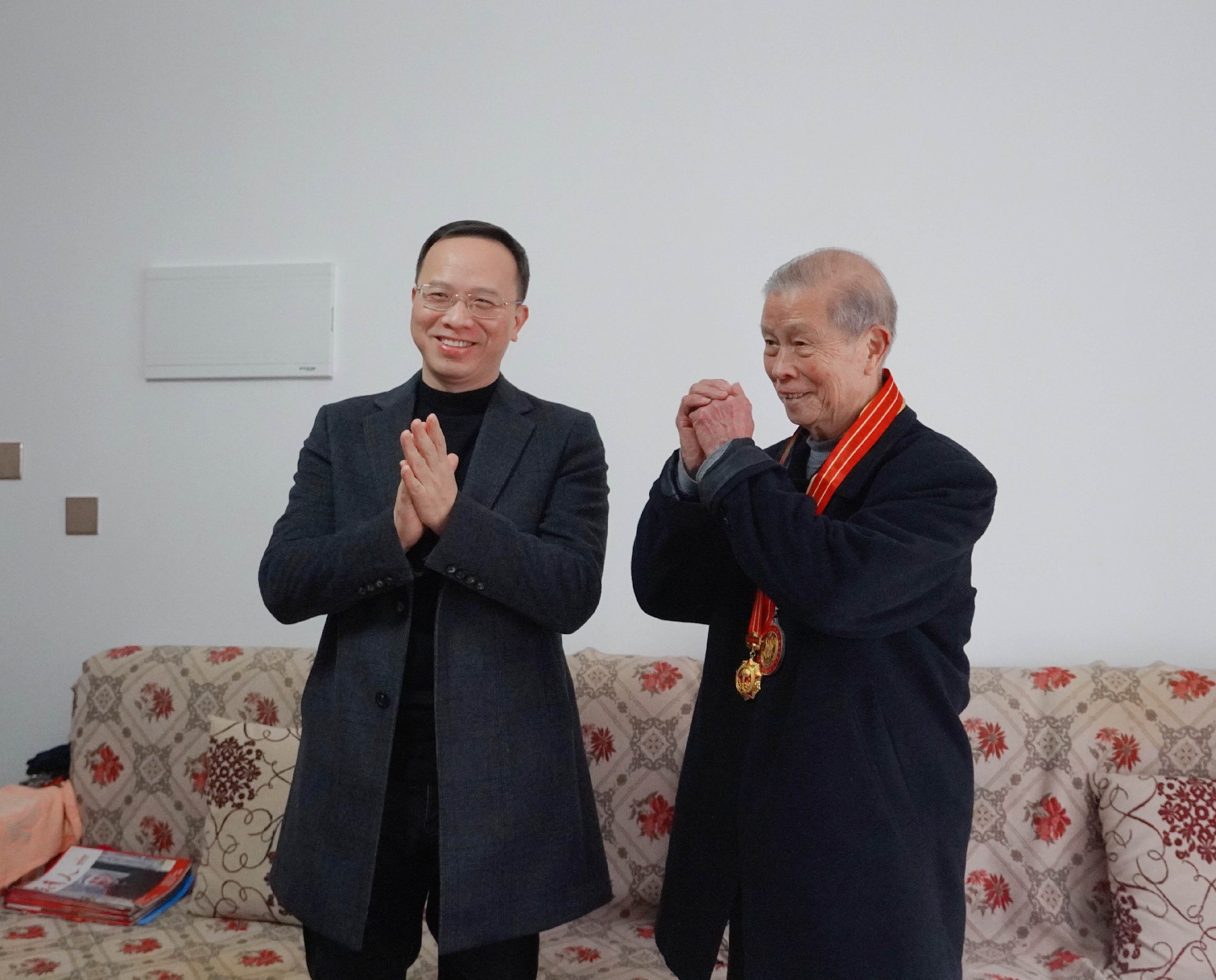 在郴州生态所湘南基地,谈文胜专程探望了“中国铀业功勋人物”杜国升。杜国升同志作为核工业系统的首批工程师,荣获原核工业部劳动模范、国家科技进步奖一等奖等多项殊荣,是中国铀业发展历程中的璀璨之星。谈文胜与杜老促膝长谈,仔细询问他的身体和生活状况,随后郑重地为杜老颁授原子弹爆炸六十周年纪念章。谈文胜感慨道:“杜老,您将毕生心血倾注于铀业勘探,为我国核工业发展筑牢根基,是湖南地质系统的宝贵财富,也是湖南铀矿堪探史的“活字典”和宝藏。值此新春佳节,祝您身体康健,万事顺遂!”杜老回忆起往昔在找铀一线的艰苦岁月,眼中满是深情与自豪。他对院党委的关怀深表感激,激动地说:“如今,我们离退休人员的生活越过越好,幸福感满满。有院党委的引领,地质事业必将迈向新的辉煌!”