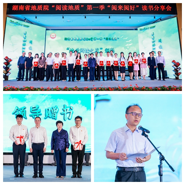 院党委书记谈文胜、院长张皓出席并为院属单位代表赠书。在家院领导为院属各单位读书协会推荐的首届“地质阅读之星”颁奖。省财政厅资环处处长刘见受邀到场作精彩分享并共同颁奖。