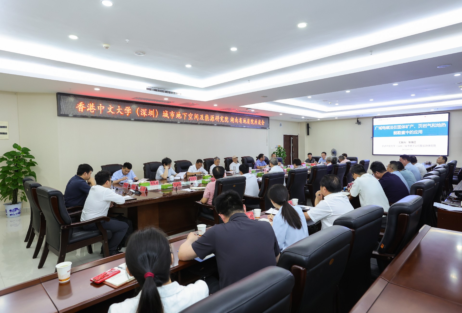 座谈会上,双方互相介绍了单位基本概况、改革发展、人才队伍建设、科研成果及平台、对外合作、海外地质、典型项目等情况。香港中文大学(深圳)城市地下空间及能源研究院5位专家学者分别围绕广域电磁法在固体矿产、页岩气和地热能勘查中的应用,新型地球物理探测装备商业化推广应用,湖南省中深层地热能选区与评价建议,湖南省煤系气及伴生绿色能源地质选区与资源评价,煤地下原位气化(制氢)及碳封存技术等课题进行了学术交流。双方就发挥各自优势,在数字地质建设、堤坝管涌隐患检测、城市地下空间、设备升级改造、中深层地热能勘探开发与利用、地质研究与工程一体化、人才交流培养、打造科研团队、建立产学研用及长期合作机制等方面探讨了契合点并达成合作共识。