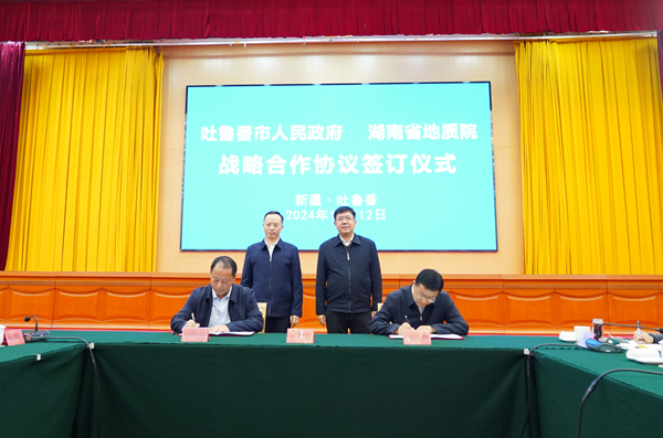 深化合作,共筑未来。11月12日,湖南省地质院与吐鲁番市人民政府举行战略协议签订仪式,共绘地质合作新蓝图。湖南省地质院党委书记谈文胜,吐鲁番市委副书记、市长克衣色尔·克尤木出席签约仪式并讲话。省地质院党委委员、副院长刘拥军和吐鲁番市副市长陈岩岭代表双方签署战略合作框架协议。