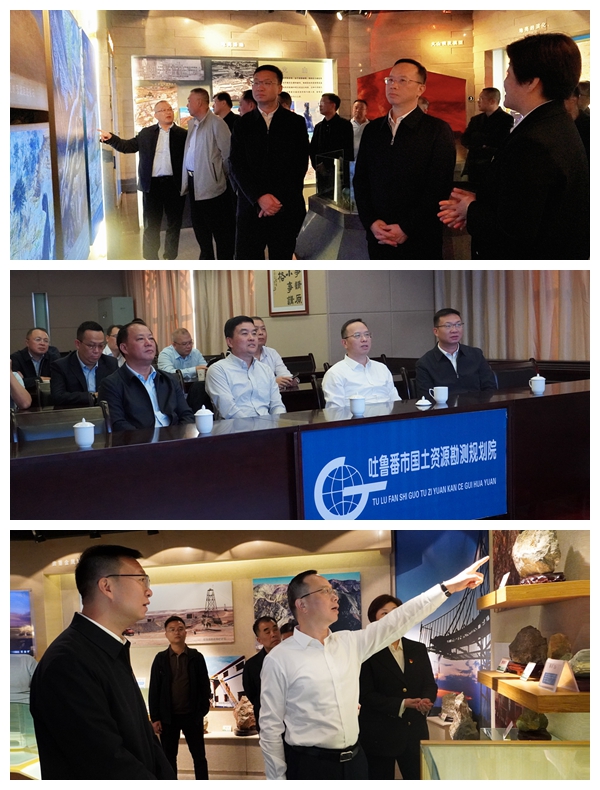 在吐鲁番市国土资源陈列馆,谈文胜一行分别参观了地球厅、资源厅、矿产厅,全面了解吐鲁番市自然资源分布及开发利用情况,并听取了吐鲁番市地质灾害应急测绘信息管理平台情况介绍,了解平台的功能、运作机制以及在实际应急中的应用效果等方面内容,全面深化相关地质工作的开展与合作,促进两地在地质领域的经验共享与协同发展。
