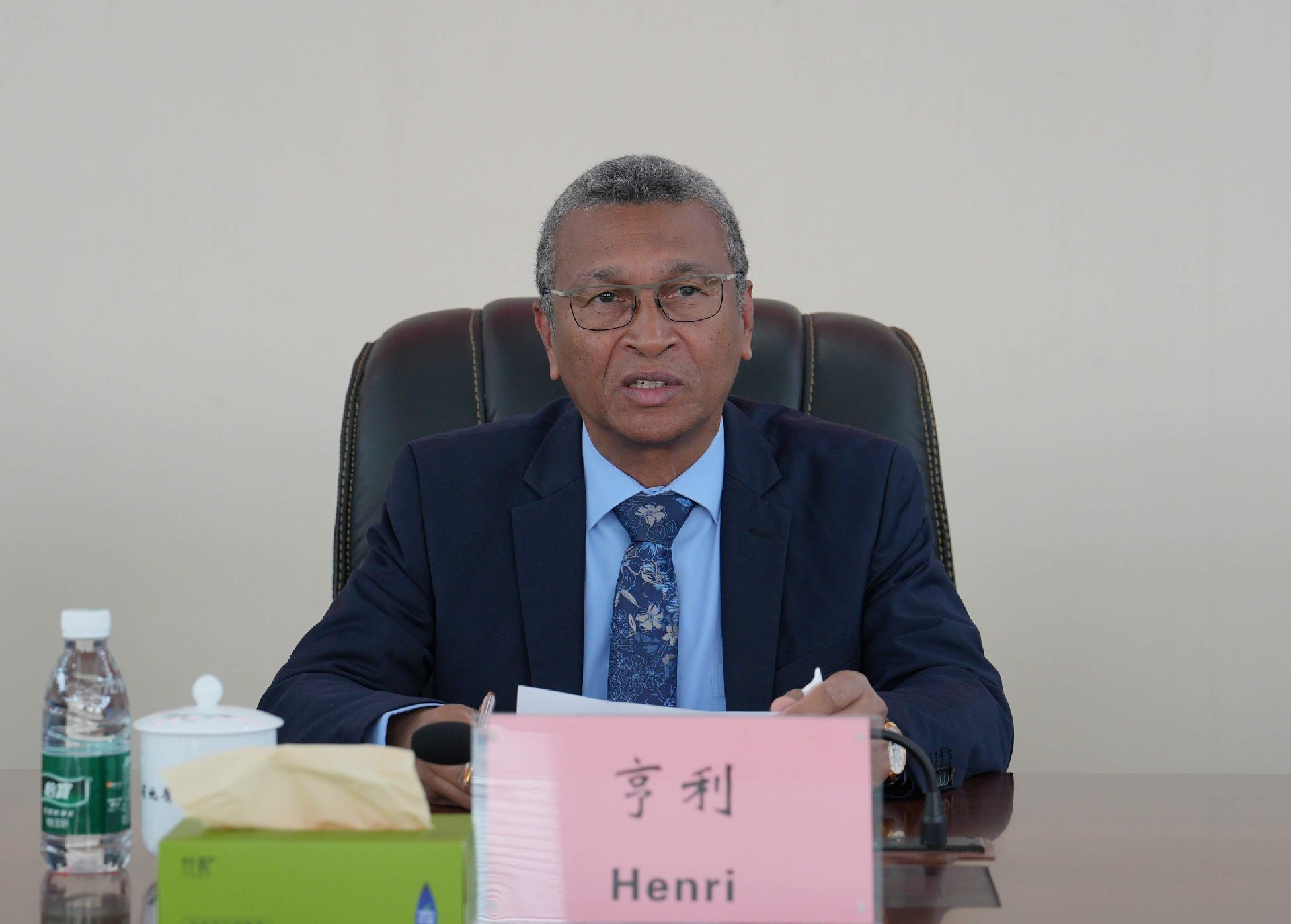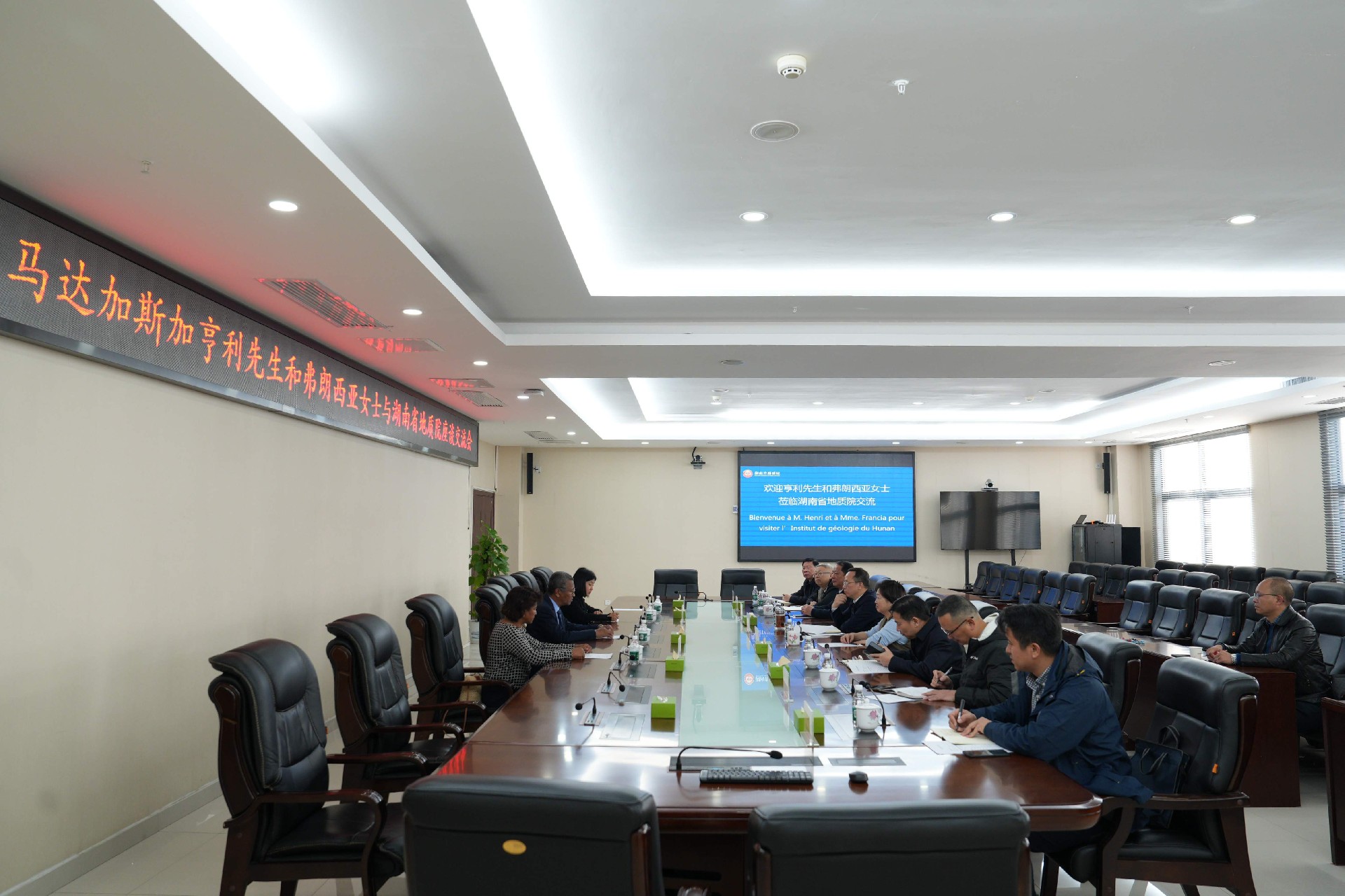 谈文胜对亨利的到访表示欢迎,并介绍了近年来湖南地质在非洲取得的一系列找矿成果。他指出,中马两国友谊深厚、合作基础坚实,近年来马达加斯加矿业部与省地质院频繁互访,加深了双方友好关系。在马达加斯加设立湖南地质非洲工作站是基于对整体环境的深刻洞察、基础条件的充分考量以及“走出去”战略的现实需求而作出的决定。马达加斯加矿产资源丰富,勘查需求迫切,湖南地质已在马实施多个项目,有雄厚技术实力和丰富经验,特别是今年4月建成的马达加斯加湖南地质检测实验室,目前可检测30多种矿物质,为非洲矿产资源勘查与开发提供了强有力的技术支持。他强调,开放合作是响应省委、省政府“搭船出海、借梯上楼”号召的有力实践,也是院“一体两翼三支撑”发展战略的组成部分,要把湖南地质非洲工作站打造成辐射整个非洲的重要平台,树立湘马合作的典范,成为中非合作的标志性项目,推动中非关系向更高层次、更广领域发展,为构建中非命运共同体贡献地质智慧与力量。