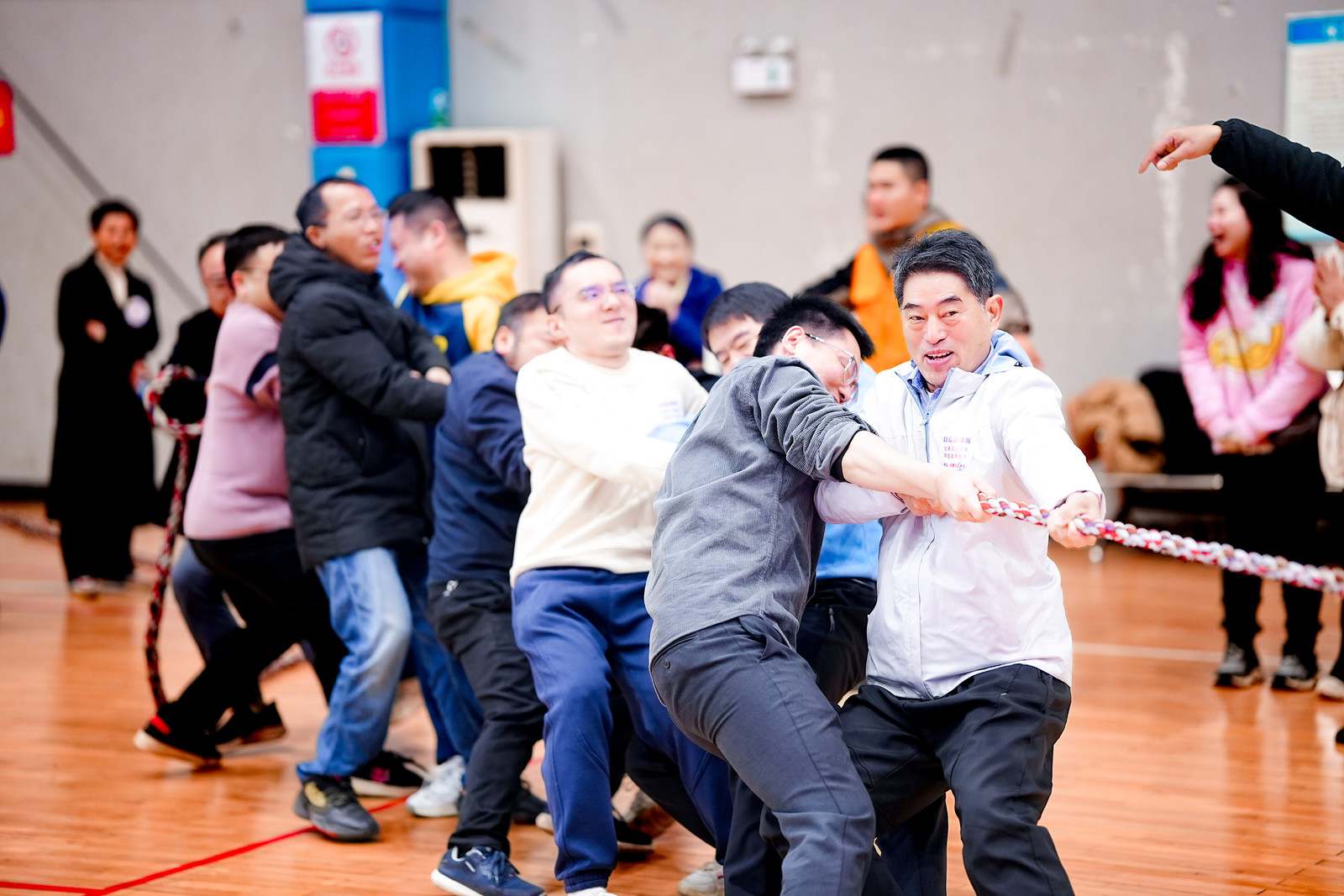 随着热身活动的结束,“步步高升”项目率先启动,每队8名队员迅速进入状态,他们齐心协力,共同搭建起象征着“新时代地质筑梦人”精神的高塔。在紧张而有序的氛围中,各队展现出极高的默契与执行力,最终用时最少的队伍凭借其卓越的团队配合与高效策略,摘得了本项目的桂冠。随后,闯关投壶与乒乓接力项目也相继展开,赛场上加油声、欢呼声交织在一起,营造出既紧张又热烈的竞赛氛围。而作为压轴项目的“欢乐拔河”,更是将现场气氛推向了顶点。在裁判的一声哨响后,四支队伍同时发力,队员们咬紧牙关,心往一处想,劲往一处使,为了团队的荣耀与信念,展开了激烈的较量。